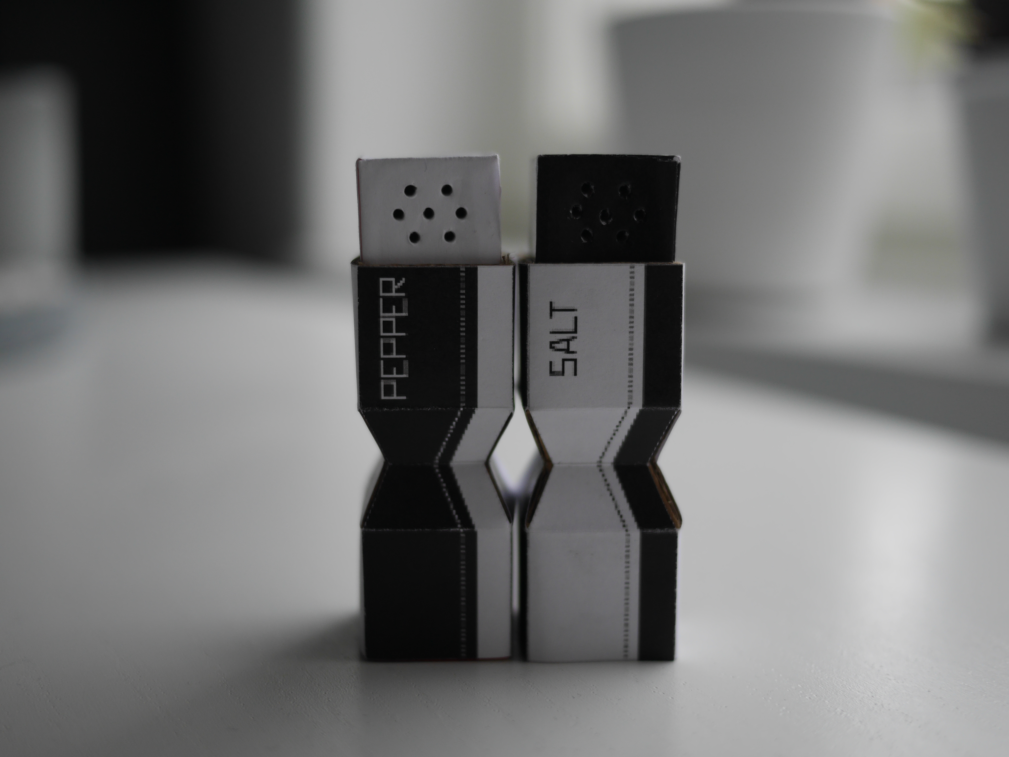 スウェーデンでの生活の中で、ランチや夏の夕食は、外の芝生で食べる機会が多くあった。 そこで持ち運び可能な塩こしょう用の紙製パッケージを考えた。後ろから押し出し、穴部分を突出させて使用する。砂時計に似た独特の形状は、内側の箱が完全に出てきてしまわないようストッパーの役目を果たしている。